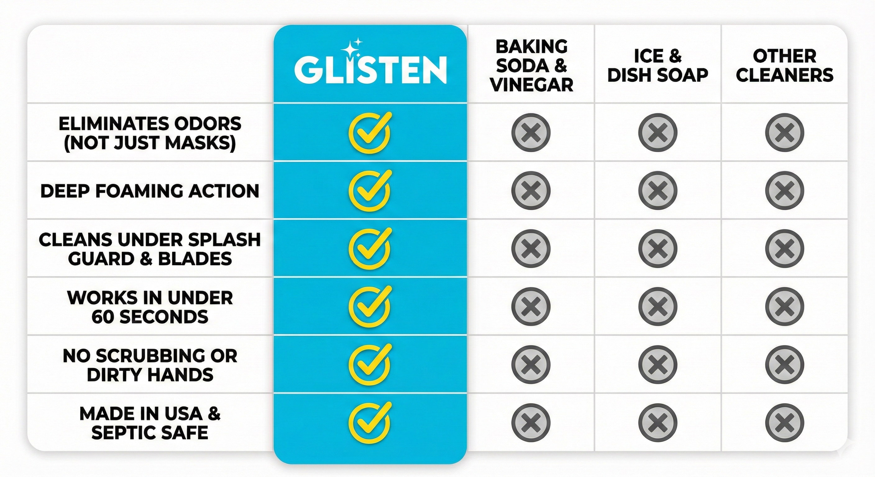Glisten's powerful foaming action penetrates deep into the disposal, splash guard, and blades to eliminate odor-causing bacteria where it hides. The result? A genuinely fresh kitchen that stays fresh—not just for hours, but for weeks.